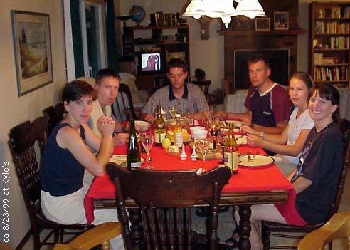 On August 18th, Michael Schwenk (take this link to his descent from our Konrad), his wife Maike, her brother Jens Ulmer, his girl friend Daniela Frank and a mutual friend Steffen Ciborovius, all from Laichingen, arrived here during a 2-3 week tour of the Western States. They all speak English quite well, and so we conversed mostly in English. By this time, I had pretty much run out of bed space - although I have a sofa sleeper in the living room. Three of them opted to camp out on the front porch rather than sleep indoors. Here is a photo taken of all seven of us by the front porch and pond.