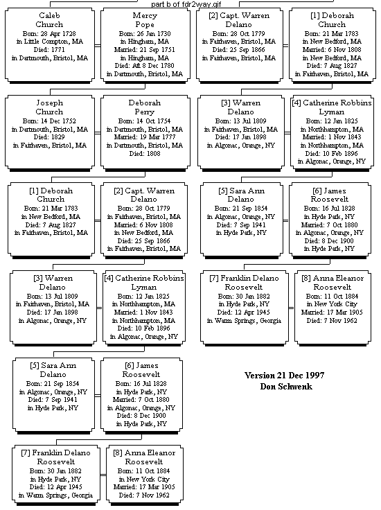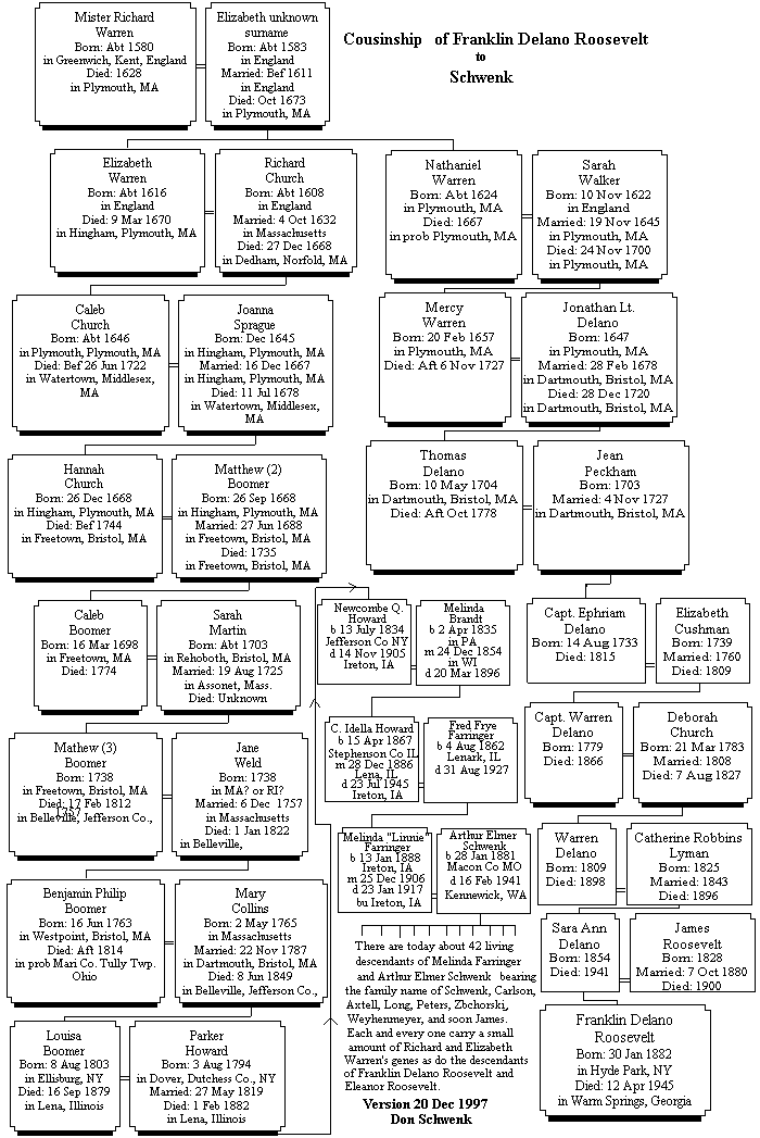 Does this mean that all these famous people are also kin to me? Well, only in a very distant and indirect way. I suspect that of all the above persons, only Winston Churchill was blood kin to FDR and could thus be a distant cousin to me, but this has not yet been researched by me. I think the other persons were related to FDR only through affinity which is to say marriage. If, for example, my wife's great-grandfather was once governor of Colorado, I could say I am related to him, but this only through affinity, not blood. Well, I hope you will enjoy this Famous Cousins page. It certainly has been pleasurable for me to create it. Don Schwenk 21 December, 1997