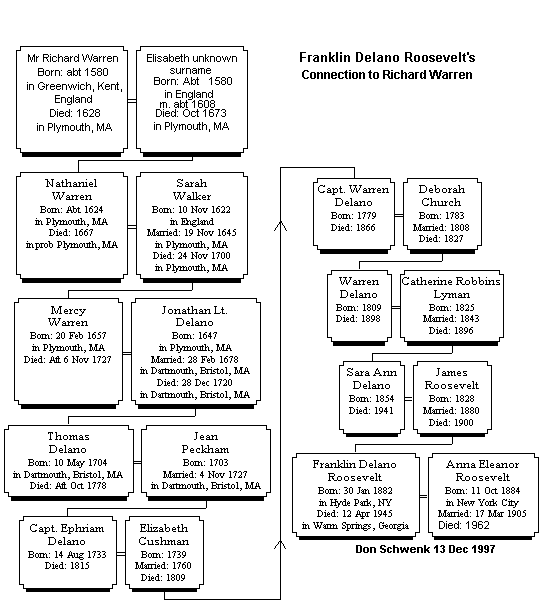 It seems natural for people to take pleasure and pride in claiming kinship to celebrated or historical figures. I am no different. However, when I began the search in 1993 for my paternal ancestry in So. Germany, that was not a goal - even though a faint possibility existed that I might uncover a Schwenk Knight ancestor along the way. I didn't! Then in 1995 through the efforts of others, I learned of my connection to the Mayflower and Richard Warren, one of the principle men who settled the Plymouth Colony. And recently (12/97) again through research by others, I learned of my cousinship to these two famous U.S. Presidents, and so I decided to share these findings here in this page. And now a little background on the common ancestor. Richard Warren was one of forty-one signers of the Mayflower Compact, a document signed at Cape Cod, Massachusetts on November 11, 1620 upon the arrival of this ship in America. These signers were the principle men on this voyage. There were about 100 passengers aboard. Some of the more prominent names of these signers were: Myles Standish, John Alden and William Bradford. These Pilgrims then proceeded to Plymouth Rock on Decembers 21, 1620 and founded there the Plymouth Colony. Richard and his wife Elizabeth brought five daughters and two sons into the world. They all married and had children. It is said there are more living descendants of this union than of any other Mayflower passengers. According to the Marist College Homepage at http://www.academic.marist.edu