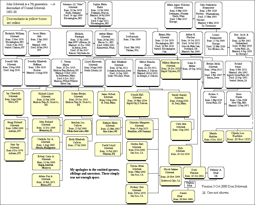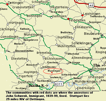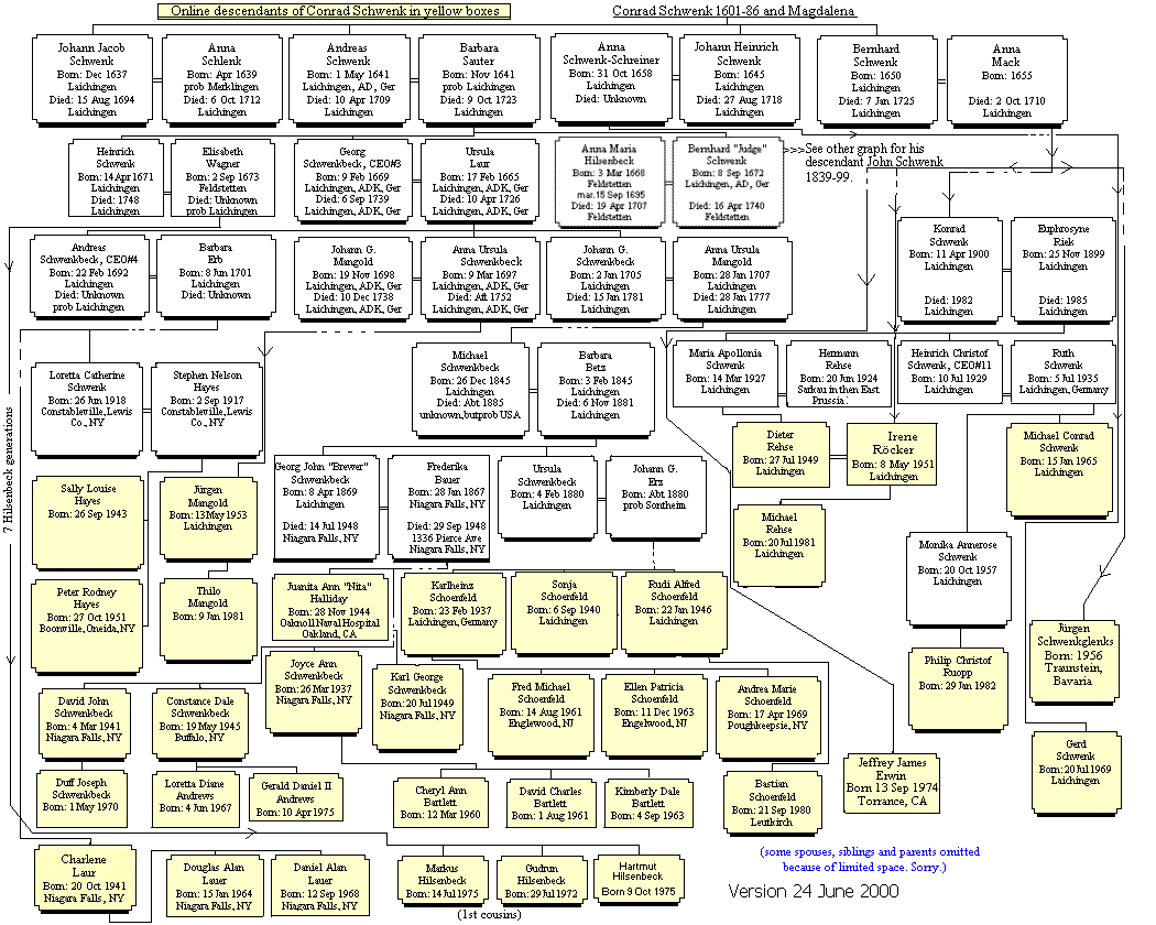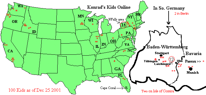 Konrad's Kids are his living descendants who have computers and send/receive electronic mail. At this point in time (7/12/01) there are 94 known Kids. All but six are descended from Andreas b. 1641. 12 of these live in Konrad's home village (now a city of 10,000); They are descended from Bernhard b. 1650 & Heinrich b. 1645 (see image below the map). In January, 1996 when I first came online, there were only six of us, that is, six online descendants of Konrad that we knew of. As time went by, more and more of our known kin came online. Then in January, 1997, our SchwenkNet Website was created (as of 11/00 defunct). Through visits there by internet users who had entered Schwenk into search engines, nearly a dozen other distant online cousins have come to light and are now "Subscribers." So, what is this Konrad's Kids' Klub? What is its purpose? Nothing in particular. It is simply a network of diverse people on two continents who can trace one line of their ancestry back to a common ancestor. The other thing obviously in common is that each is online. Volunteer editors send a monthly newsletter to each "Kid" via email which announces birthdays and wedding anniversaries for that month; It tells of new cousins discovered, of newly- found facts of our Schwenk ancestry, et cetera. Since 3/99, this newsletter has been posted in this Uncle Don's Corner Website. The map below shows the geographic location of each Kid. |