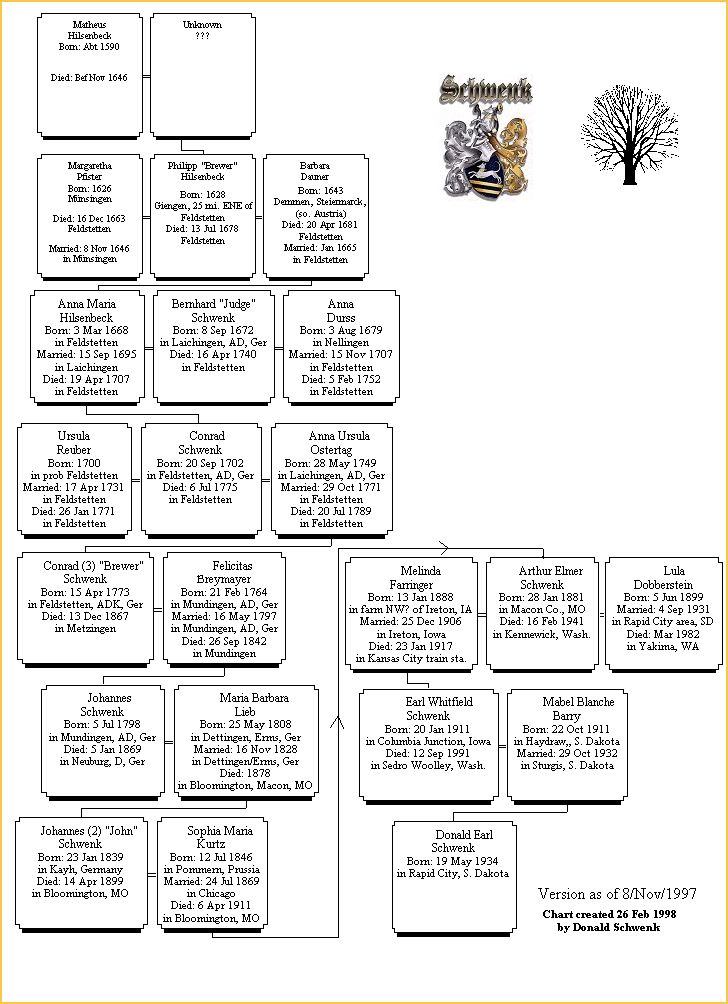 In Laichingen, just 5 kilometers east of Feldstetten, an odd development in family name evolution was occurring among the the numerous Schwenk families in the 17th century. I won't go into detail here. You can read about the many Schwenk Clans in Laichingen in this Website on the page called The Schwenk Name. One of those clans is the Schwenkbeck. A Georg Schwenk b. 1669 became a baker. The community began calling him Georg Schwenk, Beck. The name stuck, and by the early 1800s the beck part became fused with Schwenk, i.e., Schwenkbeck.