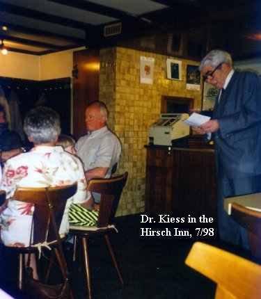 There is one more "connection" to our cousin Otto Mayer which deserves mentioning, and here it is. During the author's brief visit in Mundingen in May of 1994, a photo was taken of the only "Schwenk tombstone" in the church graveyard. This was of a Johannes Schwenk, b. 1910, d. 1984. Whose son was he? Was he our Conrad Schwenk's descendant? And if so, through which line? These were nagging questions which remained unanswered until recently, and then almost purely by chance. There were no names of Schwenk babies entered into the Mundingen birth registers during the 20th Century until the year 1947. And these were twin girls Barbara and Gertrud, whose father was the Johannes Schwenk mentioned above. The family register of this Johannes was discovered purely from "wandering" through the Mundingen microfilms. Here is what it revealed, going backward in time: Johannes >Anton >J. Jacob >Konrad >Conrad Schwenk. But here is the connection to Otto Mayer and his 85 year old mother: The wife of this Johannes Schwenk is Pauline Haydt, the sister of Babette Mayer, Otto's mother! And there surely are other relatives living today in Mundingen, the descendants of that young ambitious brewer who strolled into this village in 1797; It would only require more time and patience to search out these living descendants from the "dusty old pages" of these microfilms. And those twin girls born in 1947, the ggg-granddaughters of our Conrad, brewer? They are still living in the Mundingen area and are married to local farmers. Dr. Rudolf Kiess ran across them during a Heimatfest in the summer of 1995. They told him they knew nothing of their father's ancestry. A chart was then sent by this writer so that they might learn of their Schwenk roots. And so now, thanks to historian Dr. Kiess, we have found two more cousins. This writer visited them in June, 1996 at Gertrud's farm in Kochstetten, a hamlet a few miles NW of Mundingen. And then there is a Straub family living in Mundingen. He descended from Maria B.B. Schwenk, daughter of Konrad. And so if any of you someday visit Mundingen, you will find several relatives there, all descendants, like us, of Conrad Schwenk, brewer/Hirschwirt.