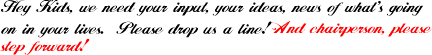 John Schwenk in Pasadena, CA has offered to assist a chairperson. And your editors will naturally work and coordinate with the chairperson. Our plea here is for one of you to step forward and get the ball rolling! Your editors will be standing by their computers waiting for your mail! Thank you.