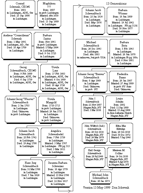 On May 12th, Don Schwenk received an email from Maureen M."Micky" Schwenkbeck of Lewiston, NY near Niagara Falls. She had typed Schwenkbeck into a search engine and was linked Don's Website. Her husband is Karl George Schwenkbeck, born in 1949 in Niagara Falls. He was already in Don's tree, but Don did not know the name of Karl's wife nor the names of two of his sibling sisters. Micky subsequently provided the missing data. Karl is a superintendant at CG/G, a carbon plant near his home. Some of his hobbies are marathon running and downhill racing on mountain bikes. Micky is very interested in family history. You can see Karl's descent from our Konrad by clicking here. Welcome to the Klub Karl!