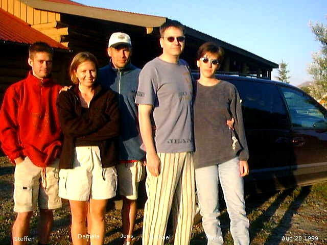 On August 18th, Michael Schwenk (take this link to his descent from our Konrad), his wife Maike, her brother Jens Ulmer, his girl friend Daniela Frank and a mutual friend Steffen Ciborovius, all from Laichingen, arrived here during a 2-3 week tour of the Western States. They all speak English quite well, and so we conversed mostly in English. By this time, I had pretty much run out of bed space - although I have a sofa sleeper in the living room. Three of them opted to camp out on the front porch rather than sleep indoors. Here is a photo taken of all seven of us by the front porch and pond.