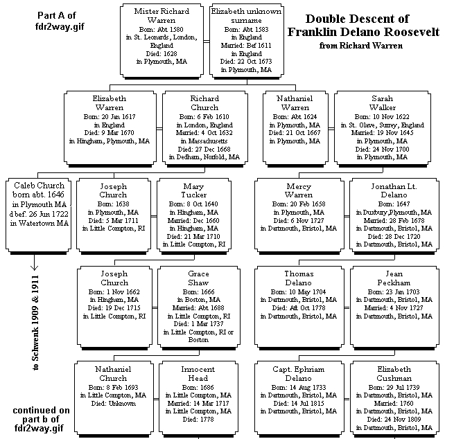 It seems natural for people to take pleasure and pride in claiming kinship to celebrated or historical figures. I am no different. However, when I began the search in 1993 for my paternal ancestry in So. Germany, that was not a goal - even though a faint possibility existed that I might uncover a Schwenk Knight ancestor along the way. I didn't! Then in 1995 through the efforts of others, I learned of my connection to the Mayflower and Richard Warren, one of the principle men who settled the Plymouth Colony. And recently (12/97) again through research by others, I learned of my cousinship to these two famous U.S. Presidents, and so I decided to share these findings here in this page. And now a little background on the common ancestor. Richard Warren was one of forty-one signers of the Mayflower Compact, a document signed at Cape Cod, Massachusetts on November 11, 1620 upon the arrival of this ship in America. These signers were the principle men on this voyage. There were about 100 passengers aboard. Some of the more prominent names of these signers were: Myles Standish, John Alden and William Bradford. These Pilgrims then proceeded to Plymouth Rock on Decembers 21, 1620 and founded there the Plymouth Colony. Richard and his wife Elizabeth brought five daughters and two sons into the world. They all married and had children. It is said there are more living descendants of this union than of any other Mayflower passengers. According to the Marist College Homepage at http://www.academic.marist.edu