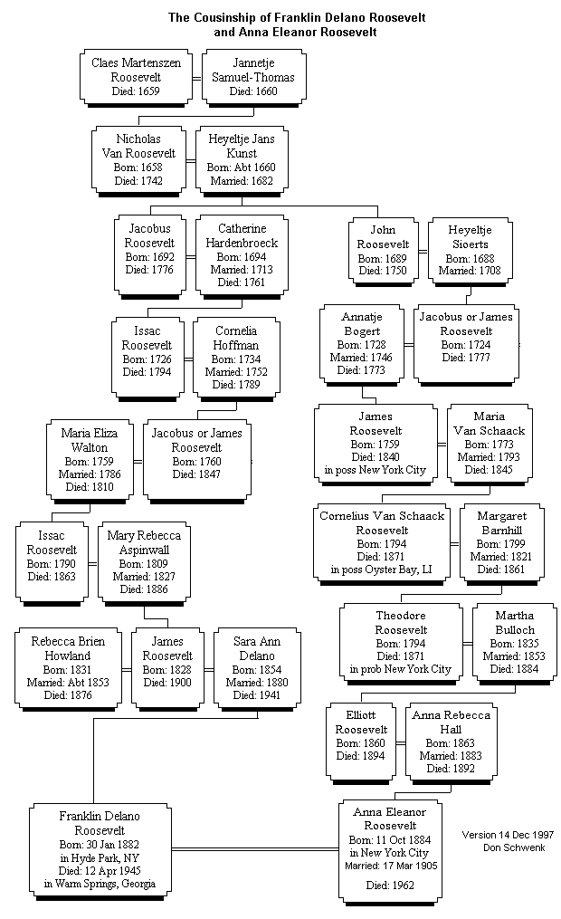 One of these trees shows the cousinship of FDR to his likewise famous wife