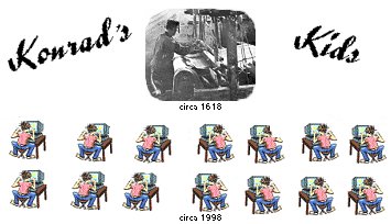 Konrad's Kids are his living descendants who have computers and send/receive electronic mail. At this point in time (7/12/01) there are 94 known Kids. All but six are descended from Andreas b. 1641. 12 of these live in Konrad's home village (now a city of 10,000); They are descended from Bernhard b. 1650 & Heinrich b. 1645 (see image below the map). In January, 1996 when I first came online, there were only six of us, that is, six online descendants of Konrad that we knew of. As time went by, more and more of our known kin came online. Then in January, 1997, our SchwenkNet Website was created (as of 11/00 defunct). Through visits there by internet users who had entered Schwenk into search engines, nearly a dozen other distant online cousins have come to light and are now "Subscribers." So, what is this Konrad's Kids' Klub? What is its purpose? Nothing in particular. It is simply a network of diverse people on two continents who can trace one line of their ancestry back to a common ancestor. The other thing obviously in common is that each is online. Volunteer editors send a monthly newsletter to each "Kid" via email which announces birthdays and wedding anniversaries for that month; It tells of new cousins discovered, of newly- found facts of our Schwenk ancestry, et cetera. Since 3/99, this newsletter has been posted in this Uncle Don's Corner Website. The map below shows the geographic location of each Kid. |