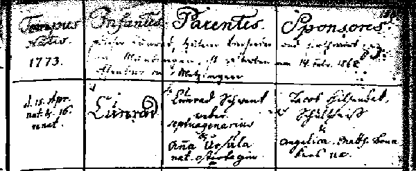 We can all safely speculate that this day must have been one of the happiest in the life of Conrad Schwenk, weaver in Feldstetten. Here he was approaching age 72. His young wife had just borne his first child. One can easily imagine the joy in that house and undoubtedly in the entire village! Note the pastor's insertion of the word "Septugenarian!" Someone, probably a pastor many years later, entered an interesting and special inscription in pencil directly above this birth entry, but you will have to read further to learn of its contents. Three years following the birth of baby Conrad, a baby girl joined the family; Anna Maria was born on May 5, 1775. She died four years later.