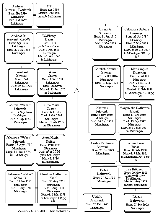From time to time I enter the name Schwenk into a search engine just to see if I can find something new. In early November, this led to a Schwenk clothing store Website in Münsingen, Germany. This caught my attention because I had known there were Schwenks living in this small city some 15 miles SW of Laichingen. I learned several years ago that two grandsons of our Konrad Schwenk had moved from L. to Münsingen (small map) in the late 1600s or very early 1700s. And so I visited this site http://www.schwenk-mode.de/ and learned that two Schwenk brothers, Dieter and Uli and their wives, own and operate this clothing store. After a short exchange of email, I learned that they did not know their paternal ancestry beyond that leading back to their gg-grandfather Gottfried Heinrich Schwenk, a weaver, b. 1816 in Münsingen, the founder of this clothing business. I then ordered the four microfilmed church records of this community from the LDS Family History Library in Salt Lake City. I have now traced the paternal ancestry of their Gottfried Heinrich back to Andreas Schwenk, weaver, b. ca. 1570 in Laichingen. And who was Andreas to us? Here is where things get sticky. It is documented that Andreas had a son, Andreas, 1616-1695, a weaver born likewise in Laichingen. It is from this son that Dieter and Uli are descended, not from our Konrad 1601-1686. So how, you may ask, are these brothers in Münsingen related to the rest of us? Well, based on much research I've done, our Konrad was an older son of Andreas Sr. My best estimate is that this is 95% probable. Unfortunately, I have found no way to prove the paternity of our Konrad because the church records were destroyed in 1634 during the 30 Year's War. So, if we accept the high probability that Andreas Sr. was the father of both Andreas Jr. and Konrad, then we can bend the rules just a bit and consider Dieter and Uli as "Konrad's Kids." If you would like to see their descent tree, click here.