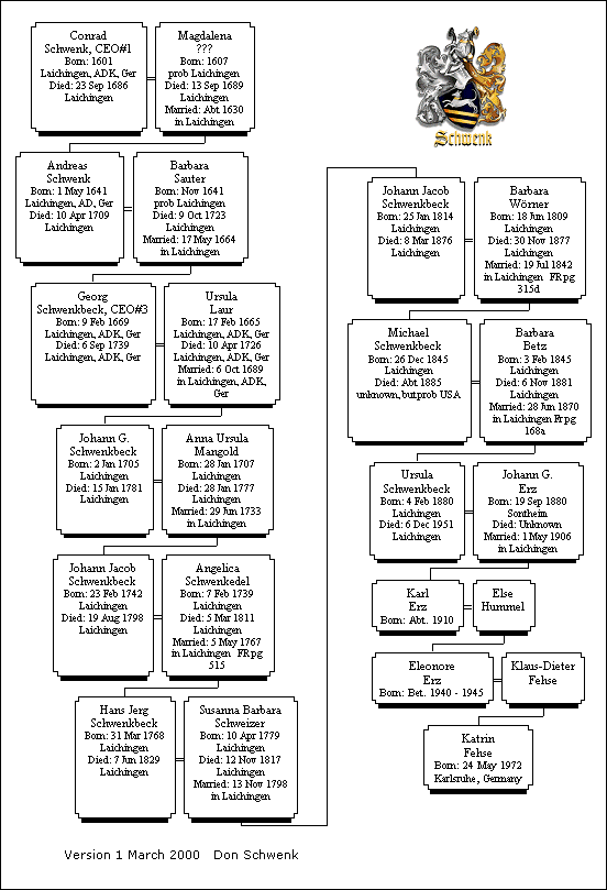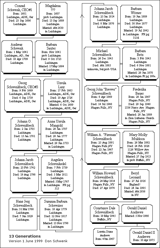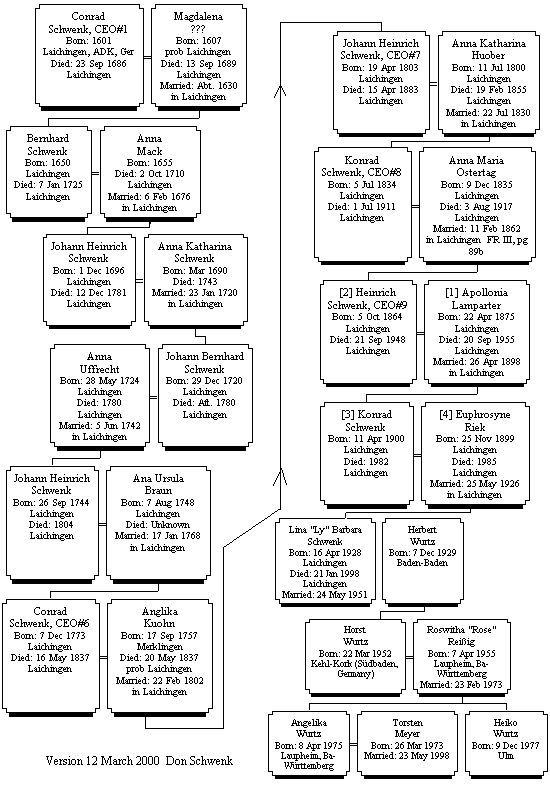 I am happy to report that the plans for the Schwenk Reunion in 2001 are progressing nicely. The exact dates for the Reunion are Wednesday, June 27 and Thursday, June 28, 200l. Many days off in the future, I know, but we also realize how our time flies, and now is the time to plan for this, one of the greatest of Konrads Kid's Occasions! All of us joining together for a visit, totally and literally "off-line", nothing virtual about it!It's truly the real thing!